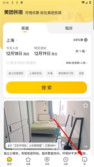 1、在美团民宿应用界面底部,找到我的选项并点击,进入我的页面。