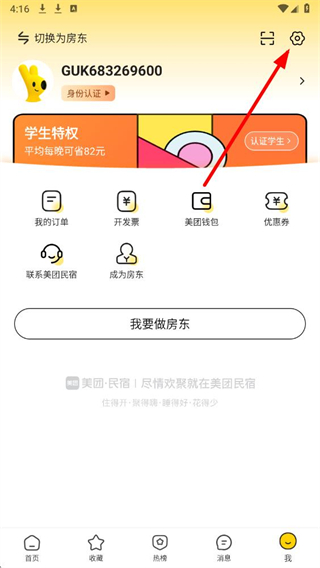 1、打开美团民宿App,点击底部导航栏中的我选项。