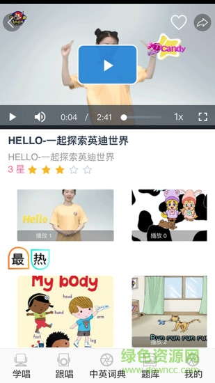 唱学堂手机版是一款非常好用的少儿英语app,可以听英文歌,可以跟着唱,还可以进行测试,在娱乐的过程中轻松学习英语知识,学唱跟唱皆可行,寓教于乐,喜爱的朋友赶快到绿色资源网下载体验吧!