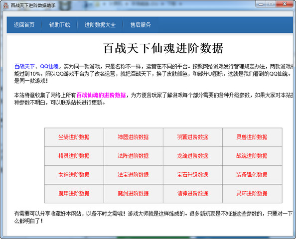 百战天下进阶数据助手包含了游戏中所有进阶的数据,包括坐骑、神器、羽翼、灵兽、精灵、法阵、龙魂、战魂、女神、法宝、宝石、装备、魔甲、魔剑、诸神、灵环等的进阶数据。