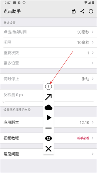 2、点击开始后,界面弹出操作栏,点击操作栏1图标,可设置点击动作。