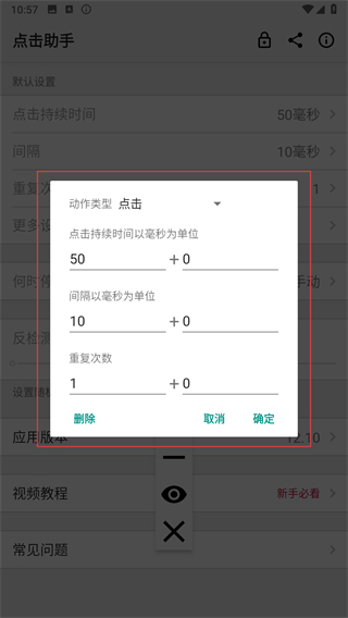 3.长按点击位置的控件会弹出单点的参数配置,可以设置单点的延迟,触摸时长,重复次数