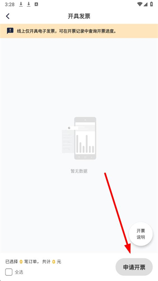 4、在充电订单开票页面,选择对应订单,确认信息后点击申请开票,即可提交充电发票的开具申请。