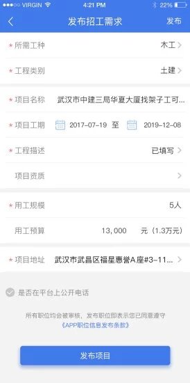 荣派工道是一款服务工人找活和用工方用工的招工找活的APP平台。用工方可通过此APP搜索平台上注册的工人,与之联系,协商用工日期,用工地点;工人也可以在平台上报名用工方在平台发布的项目,确认用工细节。