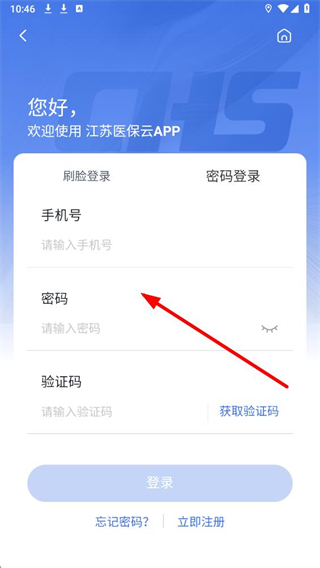 3、在密码登录界面,依次输入手机号、密码,获取验证码并,点击登录按钮,即可完成登录操作。