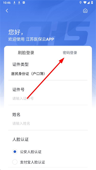2、进入登录界面后,选择密码登录选项,切换至密码登录的信息填写界面。