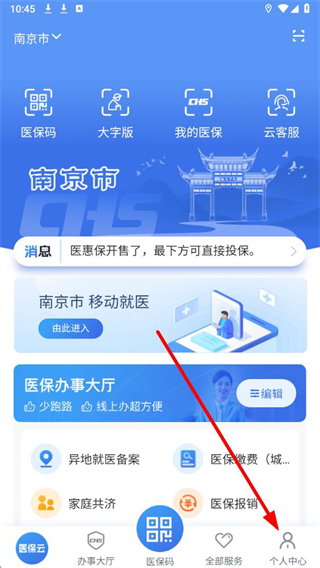 1、在江苏医保云app医保云页面点击个人中心选项,进入登录页面。