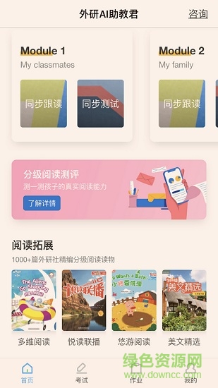外研ai学习版软件是一款供学生使用的英语学习app,可以进行听说练习,名师课程多,辅导学习效果强,可以进行阅读拓展训练,还可以进行模拟测试,欢迎喜爱的朋友到绿色资源网下载使用!