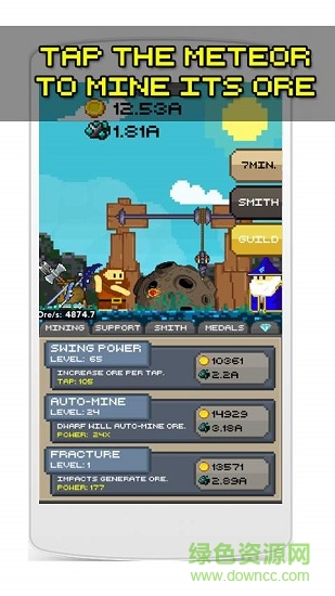 游戏采用可爱的像素画风,讲述一颗外星陨石掉落到地球上,玩家发现了这颗神秘的外星陨石并不断挖掘陨石上的神秘金属物质来致富的故事。
