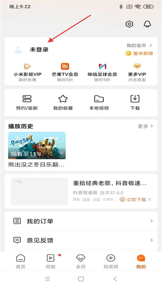 2、在个人中心页面上方,点击未登录的标识,进入登录界面。