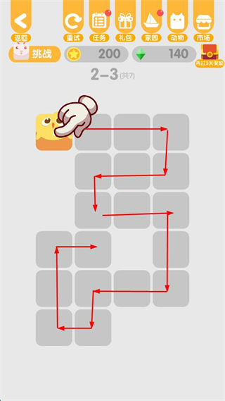 3、进入2-3关卡后,继续按照新的路径指引,完成该关卡的一笔画连线任务。