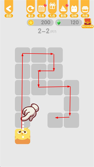 2、在2-2关卡中跟随指引,按指定路径拖动完成小鸡图案的一笔画连线。