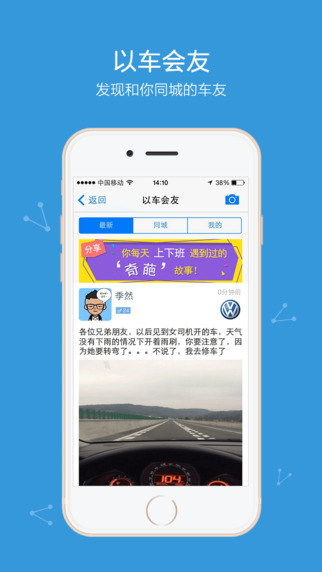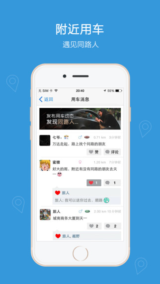 车太闲iPhone版是一款基于地理位置服务(LBS)的汽车社交应用,主要用途是通过社交圈的车主们主动发布自己的用车动态来让交际圈的朋友们有机会“蹭车”,以达到帮助有需求的朋友们,让你身边朋友成为你的免费司机,呵护你身边在意的人。更高效的使用汽车,环保节能的目的。可靠的汽车社交软件,大家快来下载体验吧