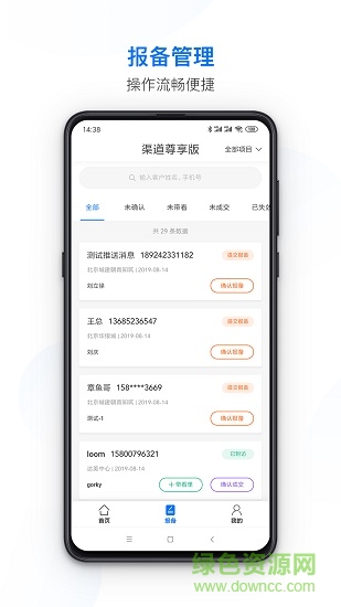 提供给渠道经理用于处理中介门店经纪人进行客户报备的管理软件。主要功能是接收及处理经纪人新房报备工单,包括确认报备、带看、成交、结佣等环节,并可上传带看及成交等相关单据,让经纪人及时了解客户购房状态信息。