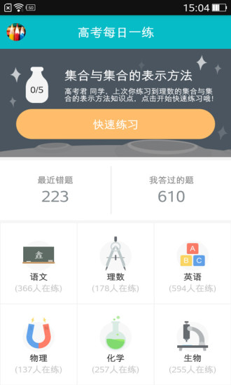 高考每日一练app是一款高考复习应用。拥有历届五年的高考试题内容,每天提供您一套经典试题进行测试!这里的每一道题都是精心筛选出来的,有助于学生在高考前有条不紊的进行学科复习。是广大高考生的手机必备神器!赶快下载体验吧!