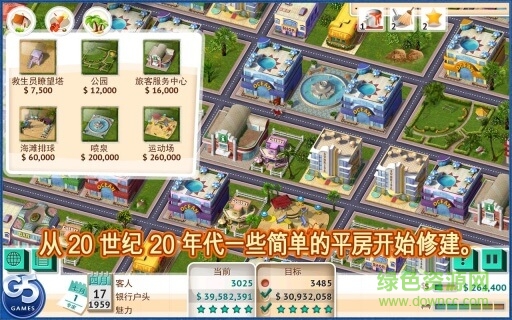 准备好建立自己的海滩度假城市吗?首先在 20 世纪 20 年代早期以简易平房进行小规模建设,然后随着时间的推移,将你的城市建成世界性大都市!在六十年的时间内,你将建设辉煌的酒店、精美的餐馆以及时尚的精品店,与此同时,你也需要管理修缮、递送、城市重建等事务。在可滚动的地图上设计你能够想到的一切,确保你那充满活力的城市具有多样性,并能够为人们提供文化、艺术、时尚和美食!