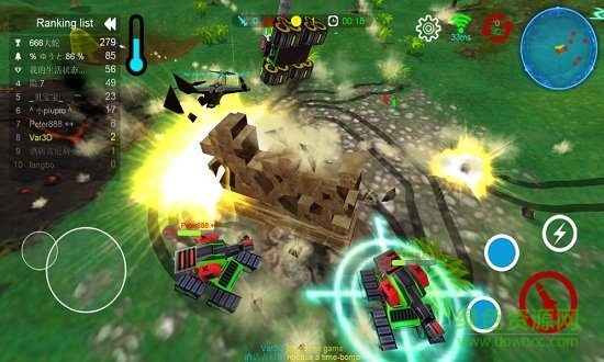 2.左边虚拟摇杆控制坦克的移动方向,右边虚拟摇杆一键式攻击.轰炸。
