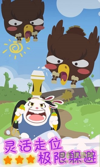 灵活的控制兔子走位去躲避天空中老鹰的攻击,期间还要寻找合适的角度去攻击老鹰,将老鹰成功的击落就可以通关了,每隔五关还会出现一个特别强大的老鹰,防御和速度都会有一定的增强。玩家通过在屏幕上滑动来躲避空中老鹰的袭击,同时还可以向老鹰开炮,把它击落。每五关会出现一个超级大老鹰,要加倍小心哟!