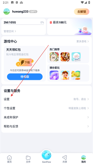 2、在个人中心页面的设置与服务区域,找到设置选项并点击,进入设置页面。