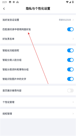 4、找到匹配通讯录中使用网盘好友选项,点击右侧的开关按钮将其开启即可。