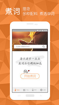 煮词是一款学英语单词的应用软件,在这里你可以轻松快乐的学习单词,除了可以熟悉单词最标着的发音,还可以和你一起聊聊单词背后的故事。 “爸爸去哪儿萌娃的英语名”“最潮奢侈品牌”“西餐菜单中的高频词”……这些,你知道纯正、地道的发音吗? 迟疑了?来煮词和大家一起看好玩的专题、练地道口语吧。欢迎下载体验!