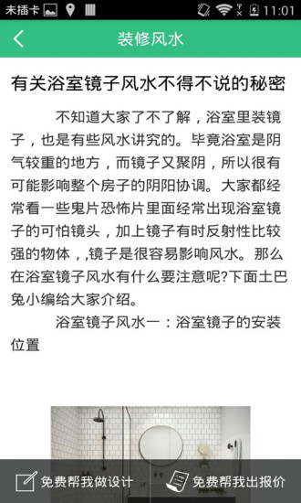 装修风水是土巴兔装修网为装修业主精心打造的一款软件,让业主、白领们,利用闲余碎片时间,即可以轻松掌握实用的风水知识和常见的煞气及化法。