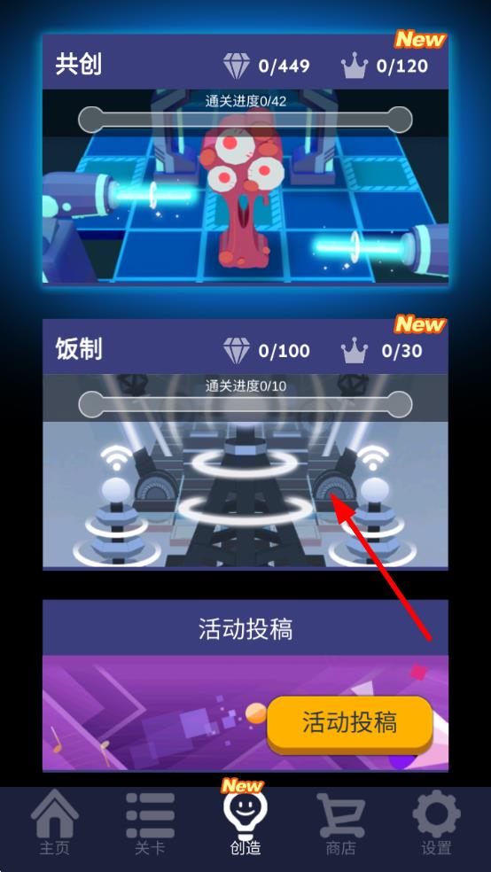 2、在创造界面中,选择共创或饭制等自制关卡分类。