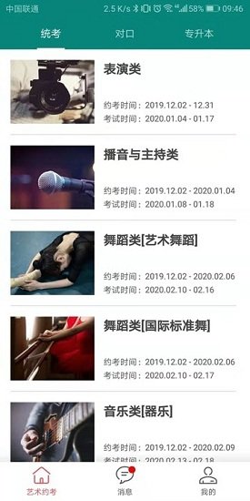 2、上面有详细的统考信息,例如舞蹈类、播音类、音乐类等等,时间和地点都非常的清晰;
