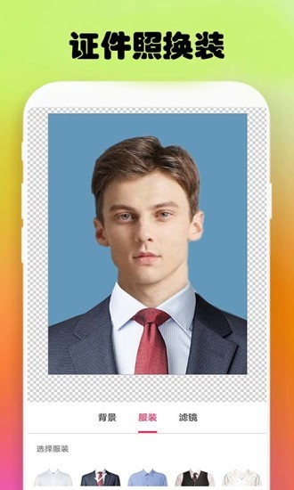 3、证件照随心换正装,内置虚拟正装,可以换成穿正装的证件照。