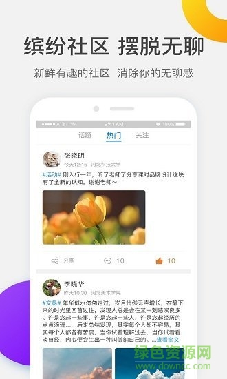 校园模块包括话题.广场和关注。话题部分是我们精选的一些大学生关心的话题,如:“学校周边美食”.“最想听的课程”.“黑室友大赛”.“每日随手拍”.“兼职”.“学习”.“考研”.“情感”等。广场部分是学生的动态内容,关注部分是用户关注好友的动态内容。让你及时了解身边热门和动态,成为校园时尚引领者。