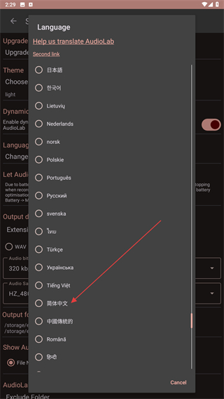 4、当弹出语言选择的页面,向下滑动找到并点击简体中文即可。