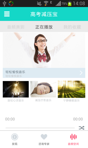 高考减压宝是专为即将高考的学生打造的服务性app,软件的主要目的是帮助他们减少压力,安心高考,这样才能发挥出最大的实力。软件是用舒缓的音乐为中学生提供一个良好的学习,休息环境。让学生们进入更好的学习,休息状态。减压宝,高考学生的必备神器。