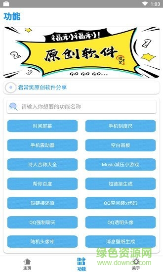 功能君工具箱是一款多功能手机工具箱。这里提供了qq装逼和各种原创小功能,用户还可以在这里自制表情包,功能是完全免费的哦。操作简单,使用方便。制作一些动漫头像也是可以的,还有抖音上的一些小工具!