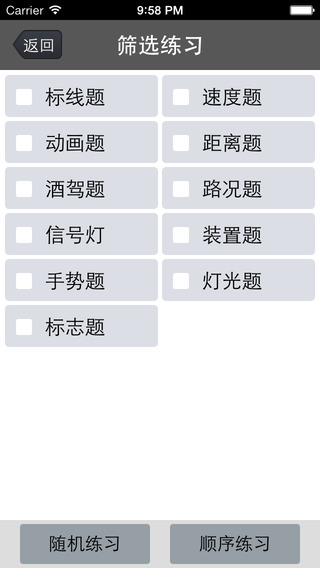 5.筛选练习:按试题类型分类,包括标志题、仪表题、手势题和罚款题等。