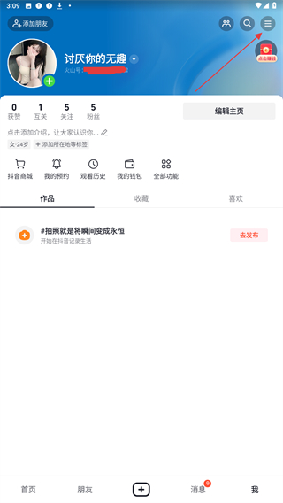2、在个人页面点击右上角的菜单按钮,展开功能列表。