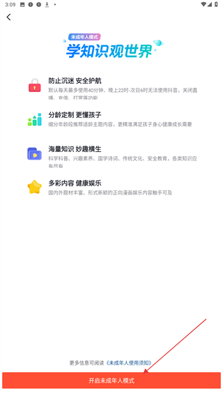 4、进入页面后,点击底部的开启未成年人模式按钮,即可完成青少年模式的开启。