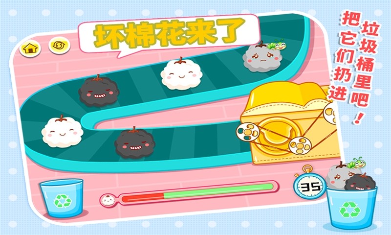 带你来到奇奇的服装工厂。这里会出现很多坏棉花、臭甲醛、残留的杂质,如果不消灭它们的话,做出来的衣服穿在身上会很难受哦!那么,怎样才能消灭它们制出好衣服呢? 1、织布过程中,将黑心棉花和长虫子的棉花扔进垃圾桶里。 2、印染过程中,用手指消灭左右两边跑进可恶的甲醛。 3、最后,将衣服里的线头和断针全部挑出才能算合格哦! 想知道怎样做出一件好衣服吗?快让宝宝到奇奇的服装工厂来体验吧!