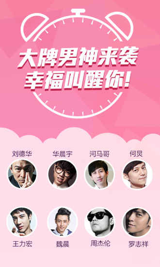 男神闹钟是一款很受欢迎的手机闹钟应用,这里拥有众多一线明星的经典闹铃供您选择!您可以在这里找到你喜欢的男神铃声,一键设置为自己的手机闹铃,让心中的男神每天换您起床!让每一个清晨都充满男神带来的感动,赶快下载体验吧!