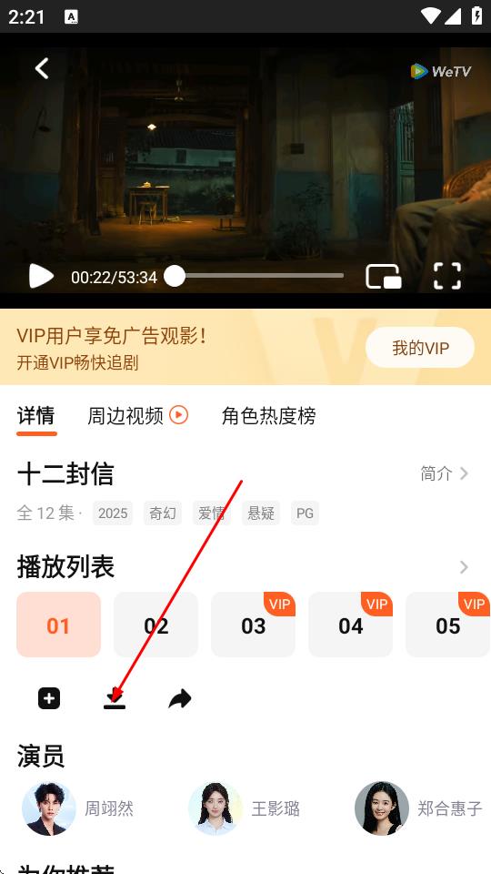 2、在视频播放页面,点击播放列表下方的下载图标。