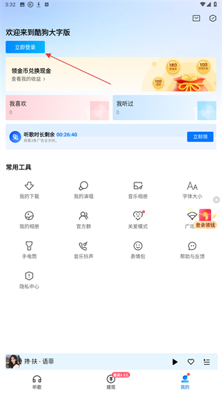 酷狗音乐大字版最新版本听歌赚钱领现金红包是一款免费的手机听歌赚钱软件,专为中老年用户设计大字版歌词显示,方便查看,软件内有海量歌曲免费播放,还支持在线K歌互动,且适配各类主流安卓机型,适合喜欢听音乐的用户,欢迎在本站下载体验。