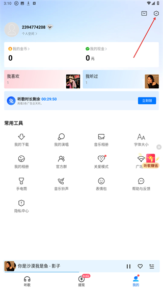 2、在个人中心页面的右上角区域,点击设置按钮,进入酷狗的设置功能页面。