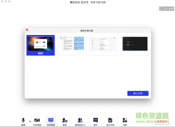 (1) 点击会议面板工具栏上的“共享屏幕”按钮