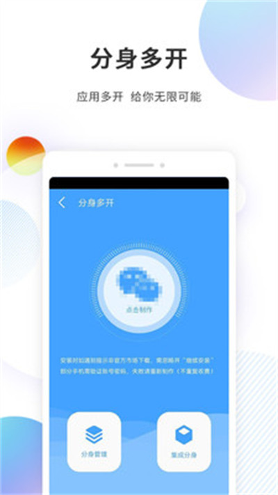 分身精灵是一款功能强大且实用的微信分身软件,为微信用户量身打造。分身多开多个账号,微信独立运行,私人与工作互不干扰。一部手机轻松实现微信多开、微信双开、微信分身,完美解决用户多个账号同时运行的需求,安全稳定,运行流畅。同时更有图片水印与空间清理等附加功能,让你在使用微信的时候更加便捷。