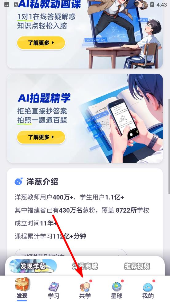 1、打开洋葱学园App,点击底部导航栏中的共学选项,进入共学界面。