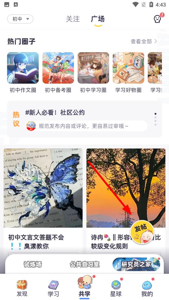 2、在共学界面中,找到并点击右下角的发帖按钮,准备发布自己的帖子。