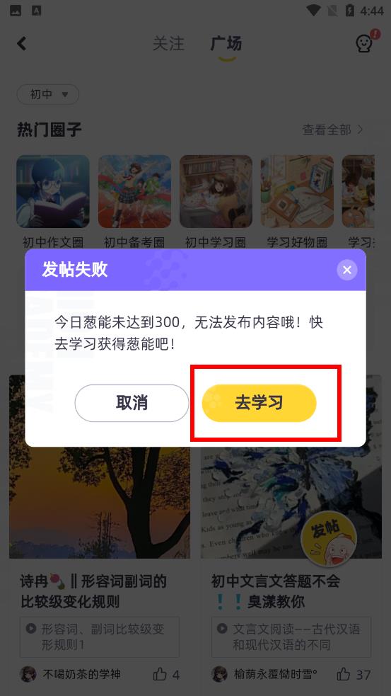 3、如果你的今日葱能未达到300,会弹出提示框,提示无法发布内容,此时点击提示框中的去学习按钮,通过学习获取葱能,达到要求后,再次点击发帖按钮。