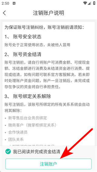 4、在注销账户说明页面,点击注销账户,完成账号注销操作。