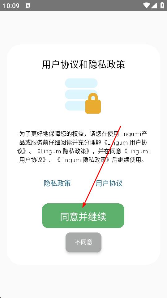 1、打开Lingumi应用,在弹出的用户协议和隐私政策页面,点击同意并继续。