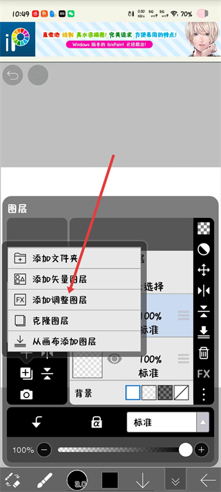 3、在弹出的菜单中,选择对应类型的图层选项,点击添加调整图层。
