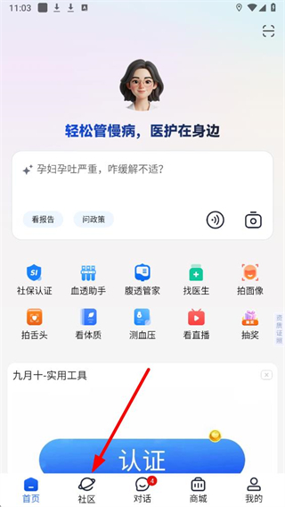 1、打开老来网app,在首页底部找到社区选项并点击,进入社区页面。